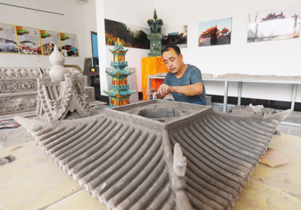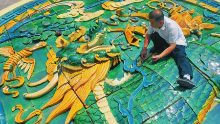 4月22日,國家級非遺項目琉璃燒制技藝傳承人劉開寶將制作的琉璃制品“麒麟獻(xiàn)端”交付客戶。