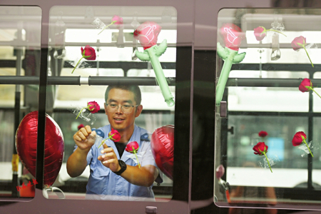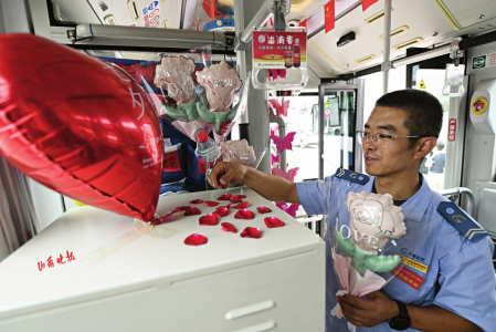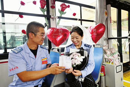 七夕節(jié)即將到來,8月8日,在太原公交第三汽車分公司,公交車廂里上演了一場別樣的浪漫——堅守在一線的兩名公交司機閻樹德和焦更新,分別為出車回來的妻子準備了大大的驚喜。用送花、提前準備飯菜、布置車廂等行動表達自己的愛意。