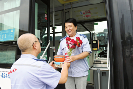 另一對公交夫妻是今年同為39歲的焦更新和李靈,均是812路公交車駕駛員,他們倆是初中同學,當天還是他們結(jié)婚第17年的紀念日。一大早,焦更新就來到車隊,布置車廂,等著妻子的到來?!袄掀?,結(jié)婚紀念日快樂!也祝你七夕快樂!”李靈看著鮮花和禮物很是驚訝,走到布置好的車廂后,更是紅了臉?!罢鏇]想到今年的結(jié)婚紀念日能收到這么大的驚喜,鮮花、浪漫的車廂,還有化妝品,很開心很感動,感謝老公的這份愛意。在工作中,我會把這份愛意傳遞給更多的乘客?!庇兄?2年駕齡的李靈,是一名五星級駕駛員,她在提升駕駛技術(shù)和服務等方面很是鉆研,工作中還有自己的很多創(chuàng)新,在車廂布置“便民袋”,放上地圖、問候乘客的手繪海報等,細微的服務打動了很多乘客,她把車廂當成自己的家一樣呵護。