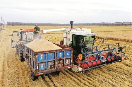 目前,中國產糧第一大省黑龍江進入秋收時間,開始大面積收獲糧食作物。位于雙鴨山市的黑龍江北大荒農業(yè)股份有限公司友誼分公司搶抓晴好天氣,合理調配機具力量,掀起秋收高潮,確保糧食應收盡收、顆粒歸倉。 新華社記者 王松攝