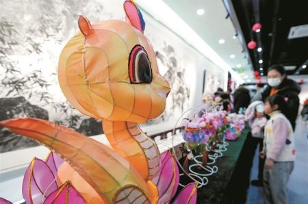 1月11日,“春風(fēng)文潤(rùn) 迎春展演暨惠民活動(dòng)”在位于南京的江蘇省文化館新街口文化客廳舉行,讓市民通過看演出、觀展覽、享非遺等多種形式,在家門口享受高品質(zhì)的文藝活動(dòng)。圖為市民們?cè)诨顒?dòng)中參觀非遺項(xiàng)目秦淮燈彩。