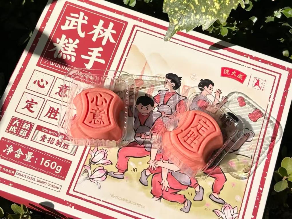 非遺傳承人們也不再滿足于“守住老味道”,更在努力跨界融合、推陳出新。沈大成最新推出的“武林糕手”心意定勝糕,內里仍是銀錠造型、香甜軟糯的糕點,外包裝設計則引入了國家級非遺項目盧氏心意拳的招式形象,受到消費者的歡迎。