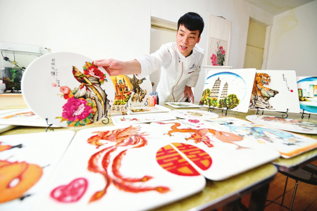 在阿峰工作室內(nèi),擺放著很多這幾年他精心制作的果醬畫(huà)作品,在方形和圓形的瓷盤上,有風(fēng)景、動(dòng)物、建筑……每一幅都栩栩如生,不僅細(xì)膩美觀,還可食用?!捌饺绽铮页斯ぷ?,最喜歡在安靜的時(shí)候琢磨,有時(shí)為了一個(gè)作品要花上五六個(gè)小時(shí)來(lái)創(chuàng)作。果醬畫(huà)讓我大開(kāi)眼界,不僅能畫(huà)出流暢的線條,還能畫(huà)出五彩斑斕的世界,更讓我找到了人生的目標(biāo)?!卑⒎褰榻B。