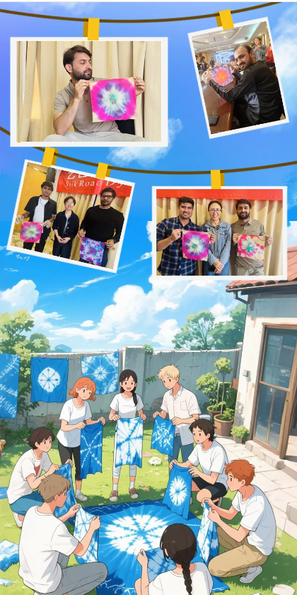 國際青年們認(rèn)真聆聽扎染的歷史淵源與工藝精髓,并通過分步演示,親自體驗(yàn)“絞纈”技法。留學(xué)生們在素色方巾上折疊、捆扎、浸染,創(chuàng)作出各具特色的紋樣。
