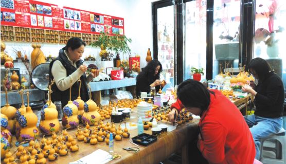 在工作室內(nèi),手工藝人侯晉麗正專注地為葫蘆彩繪。她介紹說:“我們制作的每一件葫蘆雕刻作品都需要多重工序,從篩選葫蘆到刮皮、晾曬、浸泡、拋光,再到依形構(gòu)思、打稿設(shè)計(jì),最后經(jīng)過線刻、浮雕等精雕細(xì)琢與上色收尾,每一個(gè)工序都考驗(yàn)著我們的耐心與功力?!?/p>