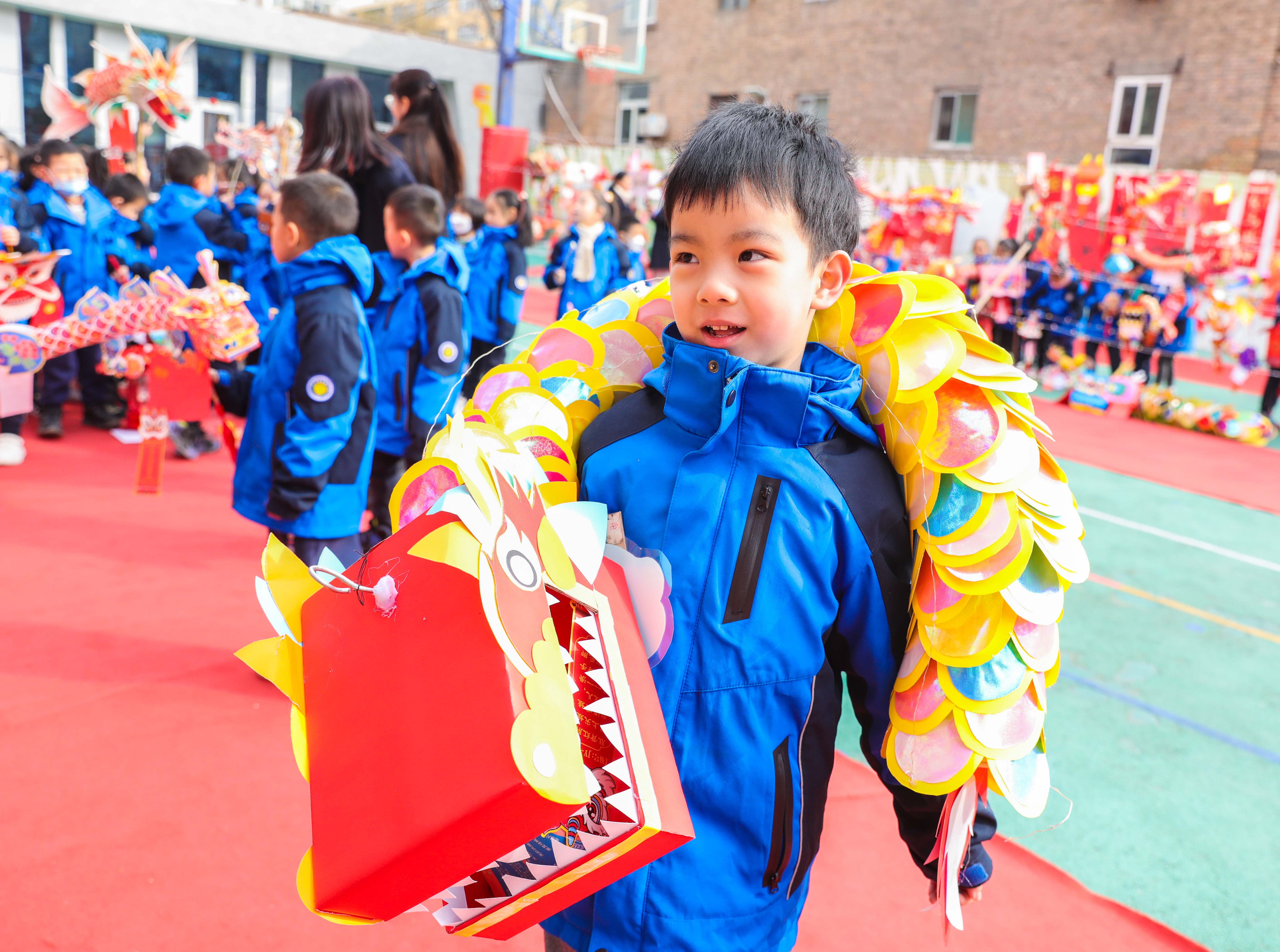 老師們精心布置的國潮風(fēng)操場,無疑是該校開學(xué)首日的一大亮點(diǎn)。操場上鋪著紅地毯,正中央是一長溜兒形態(tài)各異、栩栩如生的龍燈,兩側(cè)是一幅幅紅紅的春聯(lián)和一面面“?!弊謮Α}埬甏蠹?、魚躍龍門等祝福語隨處可見。滿滿的龍?jiān)?,點(diǎn)綴出紅紅火火的新氣象。