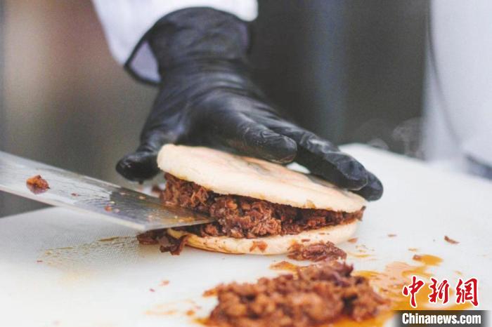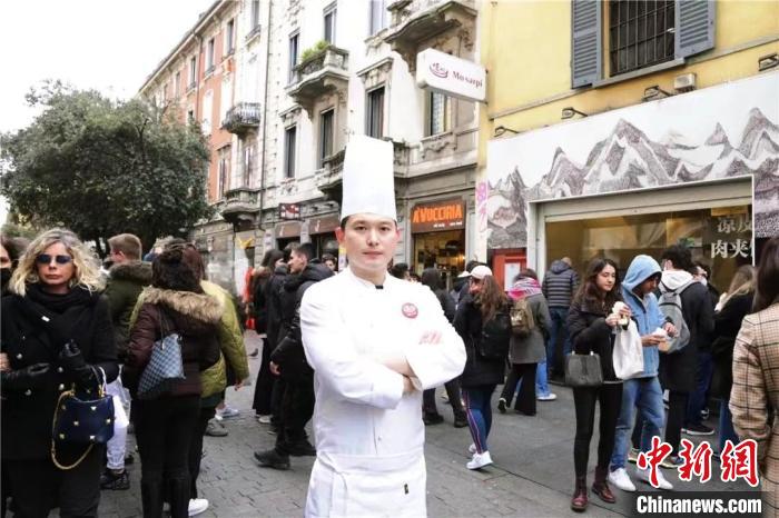 在意大利米蘭華人街,一家中國小吃店門前排著長隊。玻璃櫥窗后的操作間里,廚師撈出剛煮好的臘汁肉,切成肉燥,現(xiàn)烙的白吉饃從中切開,填入肉燥后再淋上肉汁,這饃酥肉香的肉夾饃,吸引食客們在路邊大快朵頤。