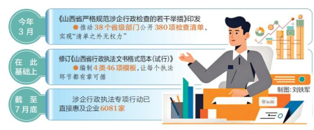 建立執(zhí)法清單,規(guī)范執(zhí)法行為。今年3月,省政府辦公廳印發(fā)《山西省嚴格規(guī)范涉企行政檢查的若干舉措》,推動38個省級部門公開380項檢查清單,實現(xiàn)“清單之外無權力”。同時,省司法廳推動各級行政執(zhí)法部門制定并公布年度行政檢查工作計劃,合理確定本單位對同一企業(yè)實施行政檢查的年度頻次上限,以及行政執(zhí)法部門的職責邊界。目前,已有21個省級行政檢查主體公布了行政檢查年度頻次上限,全省上半年涉企檢查總量同比下降36%。在此基礎上,修訂《山西省行政執(zhí)法文書格式范本(試行)》,編制4類46項模板,讓每個執(zhí)法環(huán)節(jié)都有章可循,進一步規(guī)范執(zhí)法行為。