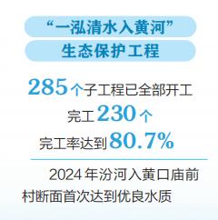與此同時,我省牢記習(xí)近平總書記寄予山西“一泓清水入黃河”的殷切期盼,2023年6月,啟動了“一泓清水入黃河”生態(tài)保護(hù)工程,計劃用三年時間,對黃河的第二大支流——汾河,進(jìn)行全流域、全方位治理。“一泓清水入黃河”生態(tài)保護(hù)工程在聚焦水質(zhì)改善目標(biāo)的基礎(chǔ)上,銜接水網(wǎng)建設(shè)、防洪能力提升、黑臭水體治理等多種類型,通過上下游、干支流、左右岸、水陸域一體謀劃,治污、調(diào)水、清淤、增濕、綠岸一體實施,取得了初步的生態(tài)效益、社會效益、經(jīng)濟(jì)效益。如今,285個子工程已完工230個、完工率達(dá)到80.7%。