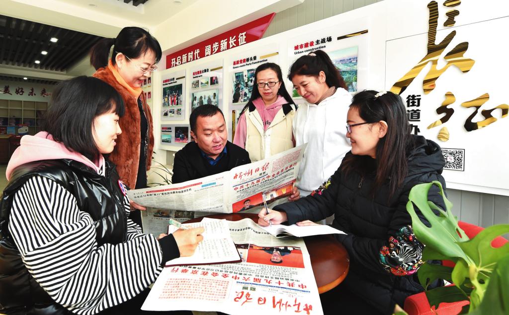 忻府區(qū)長征街街道辦事處和平東街社區(qū)工作人員認真學習十九屆六中全會精神。馮曉磊 攝