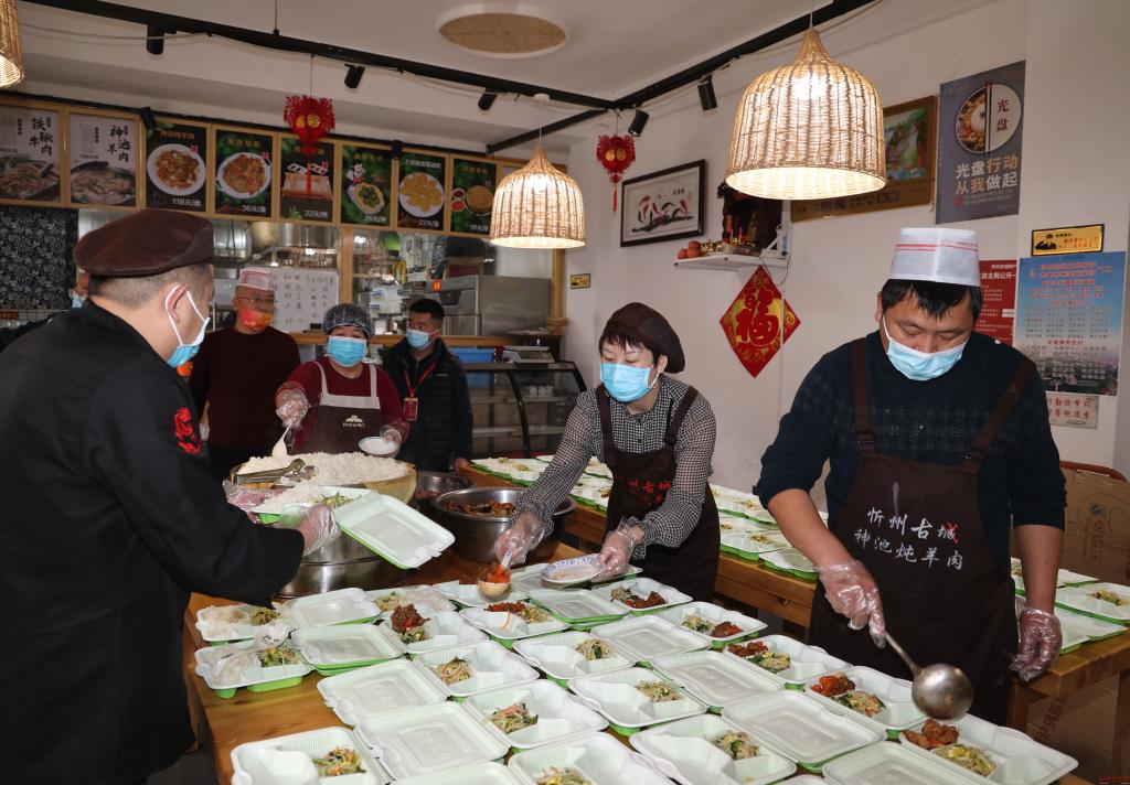 “那個餐盒再加點(diǎn)菜,湯要另外盛。”2月28日上午11時,忻州古城的神池?zé)跹蛉獠宛^里,趙海英正忙亂地招呼著店員們將剛出鍋的菜分裝到餐盒里,丈夫武海軍將打包好的餐盒裝到車上。為了準(zhǔn)備這份愛心午餐,夫婦二人當(dāng)天上午8點(diǎn)就開始在后廚里準(zhǔn)備。從配菜、烹制到打包、送餐,他們都格外用心,嚴(yán)格把關(guān)。