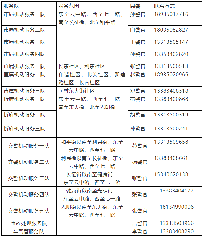 機(jī)動服務(wù)隊便民服務(wù)電話