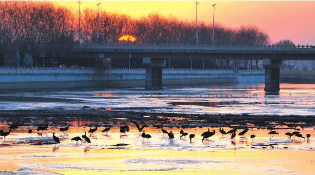 作為國家4A級旅游景區(qū),滹源景區(qū)依托滹沱河生態(tài)資源而建,220萬平方米的區(qū)域內(nèi),“一帶二廊三區(qū)串珠狀”的分布格局,將濕地、河島、蘆葦蕩等多樣生態(tài)景觀有機串聯(lián)。全長80公里的滹沱河穿境而過,橡膠壩蓄水形成的連片淺灘水質澄澈,魚蝦、水生昆蟲等生物資源豐沛,完美契合了黑鸛淺水區(qū)覓食、喜靜避擾的生活習性,為它們提供了理想的棲息環(huán)境。
