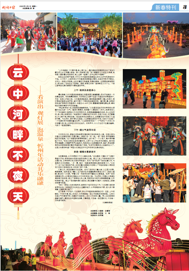 “上午泡溫泉,下午看非遺,晚上賞燈會(huì),一整天都被安排得明明白白!”來自內(nèi)蒙古的王女士笑著分享她一家人的新春行程,“孩子最喜歡下午的社火表演,我和愛人就盼著去泡湯放松,晚上全家一起看燈,這年過得才叫圓滿!”