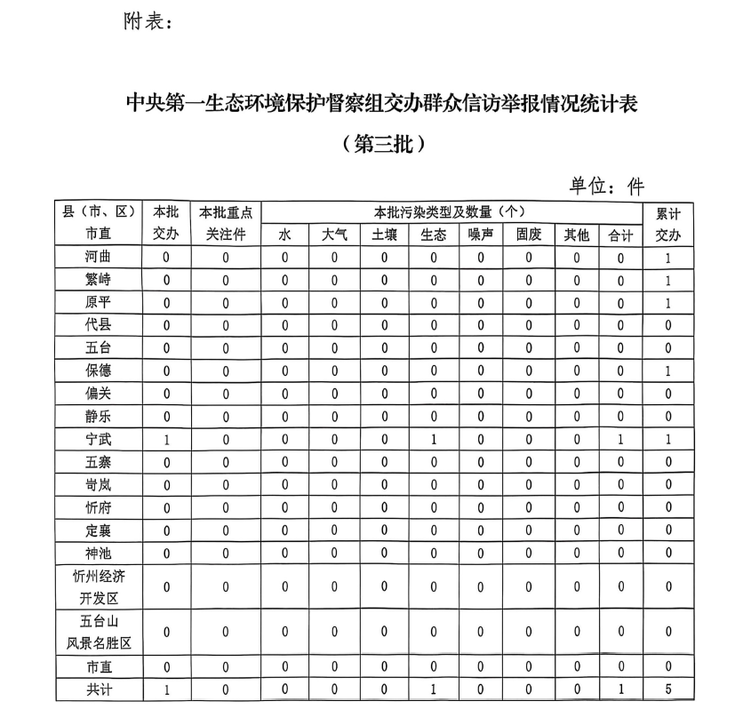 按區(qū)域和部門劃分,寧武縣1件。本批轉(zhuǎn)辦的信訪件,涉及生態(tài)環(huán)境問題1個(gè),其中,生態(tài)破壞問題1個(gè)。