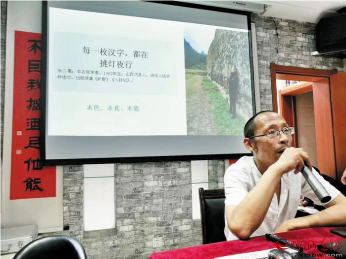 本報(bào)訊 8月15日晚,位于忻州市七一北路的好目匠眼鏡店迎來(lái)一場(chǎng)文學(xué)盛會(huì)。保德縣、岢嵐縣、五寨縣、原平市、定襄縣的詩(shī)歌愛(ài)好者,與忻州城區(qū)的詩(shī)歌愛(ài)好者一起聆聽(tīng)了著名詩(shī)人張二棍關(guān)于詩(shī)歌創(chuàng)作的講座,甚至有詩(shī)歌愛(ài)好者專門從北京趕回忻州。當(dāng)晚,連講座廳外都站滿了聆聽(tīng)的人。