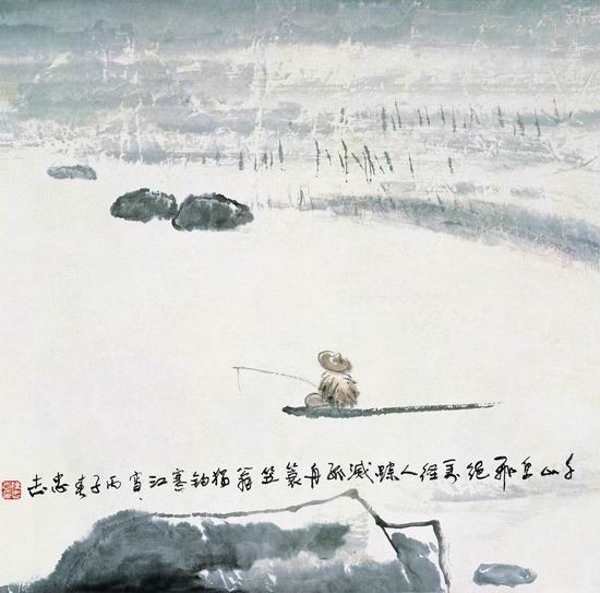 賈冰吾《寒梅》。來自人民網(wǎng)書畫頻道“人民美術(shù)館” 烹雪煮茶也是文人鐘愛的消遣方式。陸游《雪后煎茶》曰,“雪液清甘漲井泉,自攜茶灶就烹煎?!边€有人將梅花枝頭積雪掃下,貯藏地窖供夏季飲用?!都t樓夢》中妙玉給寶玉泡的茶,便是“收的梅花上的雪”,寶玉細(xì)品之后,“果覺輕浮無比,賞贊不絕。” 雪花片片書心緒 一切景語皆情語 看著漫天飛舞的雪花,每個人的心態(tài)感受不盡相同,有人安享歲月靜好,有人則觸景生情。柳宗元《江雪》詩云,“千山鳥飛絕,萬徑人蹤滅。孤舟蓑笠翁,獨(dú)釣寒江雪?!焙蠖鋵㈢R頭拉遠(yuǎn),用“寒江雪”烘托出蒼茫一片的氣氛,勾畫了一位不畏嚴(yán)寒仍專心致志釣魚的老漁翁的形象——這恰是作者本人的思想感情的寄托和寫照,表達(dá)自己不屈而又孤寂的情緒。