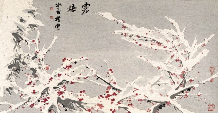 賈冰吾《竹》(指畫)。來自人民網(wǎng)書畫頻道“人民美術(shù)館” 因?yàn)檠o聲無味,在沉沉夜色里,雪的形象難以捕捉,因此詠雪詩中寫夜雪的并不多。白居易的《夜雪》卻能不落正面描寫的窠臼,“已訝衾枕冷,復(fù)見窗戶明。夜深知雪重,時聞?wù)壑衤??!比姳M用側(cè)面烘托,因衾寒窗明而知有雪、因聞?wù)壑衤暥┲兀瑯銓?shí)自然卻韻味十足。 梅雪相依的景觀常讓風(fēng)雅之士詩興大發(fā)?!盁o梅詩興闌珊了,無雪梅花冷淡休?!眲⒖饲f認(rèn)為,梅上無雪,便少了幾分興致。歐陽修在《蝶戀花·臘雪初銷梅蕊綻》中也寫道:“梅雪相和,喜鵲穿花轉(zhuǎn)?!眲屿o之間,讓人感受到大自然在寒冷雪天仍充滿生機(jī)。