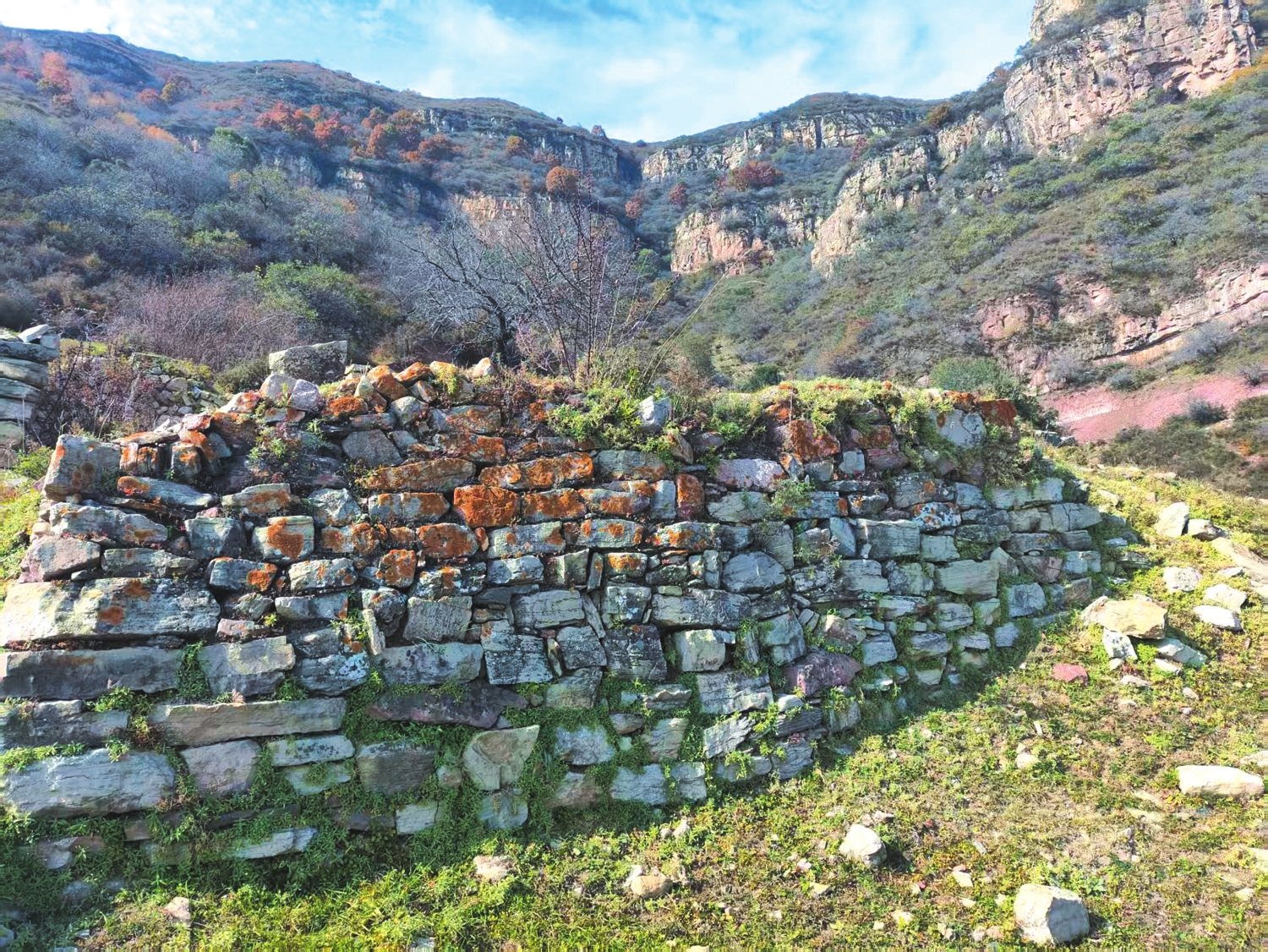 坡道在不斷升高,玉皇峁進(jìn)入我們的視野。在玉皇峁的腳下,我們看到了一處貌似村落的遺址,有磚石瓦礫散落,有殘存的石砌墻垣,有石頭筑堰的小塊梯田……玉皇峁村是一個(gè)自然村,但不知建于何時(shí),亦不知廢于何時(shí)。玉皇峁村的故事,早已消逝在千百年的煙云中,我們無法還原往昔歲月里的真相。