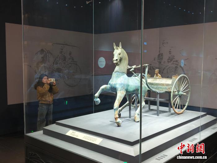 2月6日,游客在資陽(yáng)市博物館打卡被譽(yù)為“中國(guó)漢代第一車(chē)”的資陽(yáng)銅車(chē)馬。陳選斌 攝