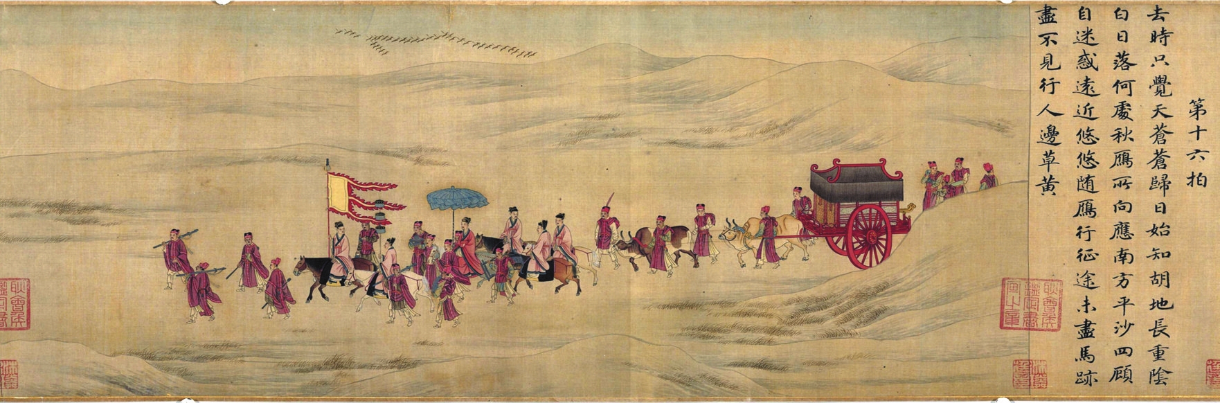 通過出土和存世的一些圖像,我們可以一窺漢代旄節(jié)之真容。洛陽燒溝61號西漢壁畫墓中的壁畫磚上繪有一持節(jié)使者;山東嘉祥武氏祠一組畫像中,描繪了漢使持節(jié)拜見王陵之母的場景,手中所持之節(jié)正是旄三重,只是看起來柄長不到八尺。至于“旄節(jié)之制”,漢代與先秦當(dāng)是有別的,將旄牛尾編成三重流蘇的制節(jié)之法始于漢,《事物紀原》載:“漢人有持節(jié),乃古旄也。然則節(jié)自周始,而旄節(jié)則起于漢也?!边@種持節(jié)使的形象,在南宋人所繪《胡笳十八拍》和《迎鑾圖》等表現(xiàn)外交題材的畫作中,仍有清晰體現(xiàn),可見這種持節(jié)出使的制度在古代一直延續(xù)。