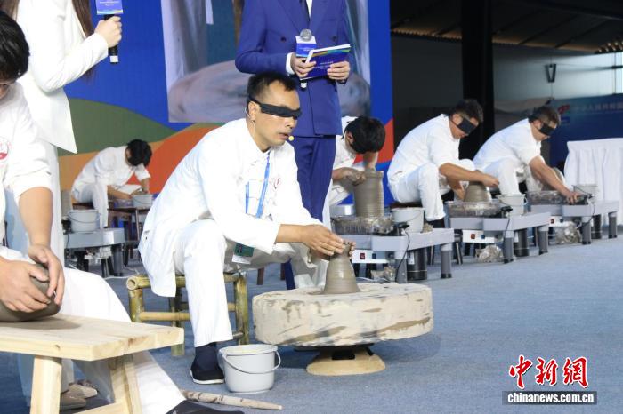 圖為許昌陶瓷職業(yè)學(xué)院特聘教授郭君健展示蒙眼拉坯。 張楠 攝