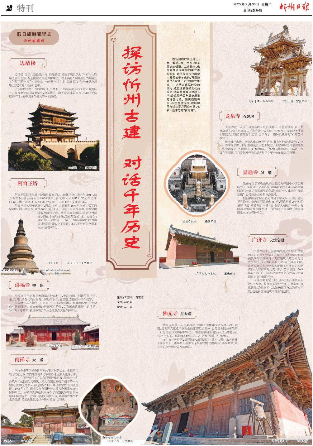 在忻州的廣袤土地上,每一塊磚、每一片瓦,都是歷史的低語。從南禪寺、佛光寺榫卯間留存的唐代木構(gòu)風(fēng)華,到洪福寺宋代雕塑中凝固的千年佛韻,再到邊靖樓“威鎮(zhèn)三關(guān)”的明代雄姿……這些古建似時(shí)空的切片,或見證著佛教文化的傳承,或以精美雕塑詮釋藝術(shù),是感受千百年歷史厚重的絕佳之選。國慶假期將至,不妨走進(jìn)忻州,在凝眸間與過往歲月隔空對話,收獲一段難忘的“古建游”。