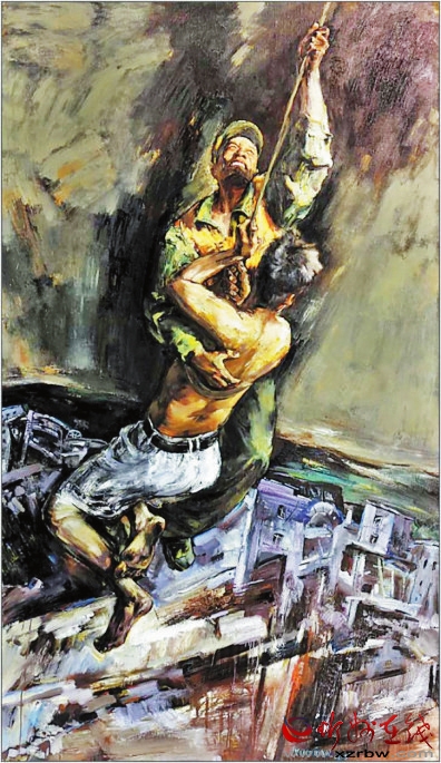作品《空中救援》中,觀者首先感受到的就是難度。主題表現(xiàn)的事件難度和畫(huà)面表現(xiàn)處理的難度交織在一起,讓我們?cè)隗@險(xiǎn)、焦急的心理壓力下感受到生命的脆弱??罩芯仍闪松奈ㄒ煌ǖ?。救援同樣是險(xiǎn)象環(huán)生、驚心動(dòng)魄。從畫(huà)面處理技巧上是一種挑戰(zhàn),天空與地面的透視關(guān)系,動(dòng)感與靜態(tài)的對(duì)立統(tǒng)一,那種命懸一線的緊迫感對(duì)心理的沖擊力,通過(guò)大刀闊斧的刮刀、筆觸處理,和蒼涼緊迫的色調(diào)關(guān)系,準(zhǔn)確地展示了主題思想,大膽省略了一些不必要的細(xì)節(jié)描寫(xiě)。用大筆觸、大色塊表現(xiàn)背景的壓抑和險(xiǎn)峻,救援主體成為沖破這一重壓的希望之色。沒(méi)有去刻意刻畫(huà)天與地的真實(shí)場(chǎng)景,簡(jiǎn)潔概括但不呆板空洞,這種果斷的駕馭,是續(xù)鶴賢真實(shí)實(shí)力的體現(xiàn)。 邢晨聲 文