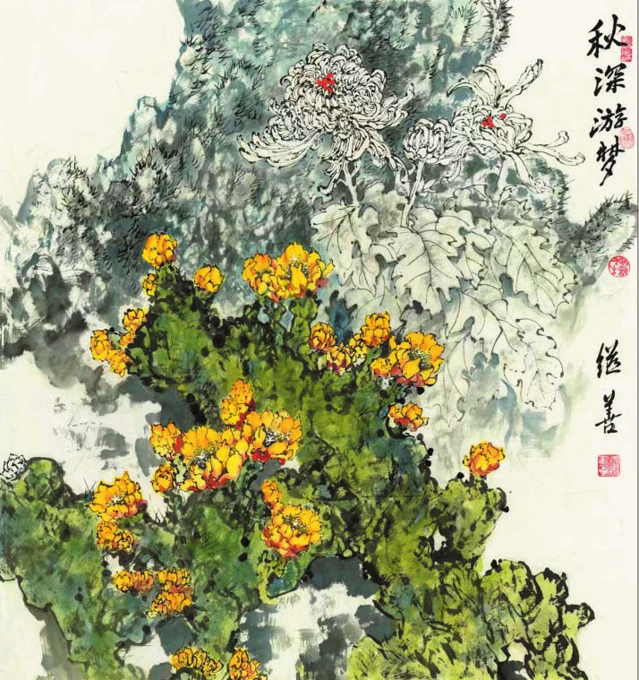郜繼善的重彩花鳥畫偏傳統(tǒng),筆法細(xì)膩工整,色彩明麗典雅,構(gòu)圖大氣別致,情趣盎然,意境深遠(yuǎn)。作品中各種元素有機(jī)融合,自然穿插,形成和諧有序的布局,讓人既能感受到自然界的豐富與絢爛,又可體味藝術(shù)帶來的愉悅和感動。在他的筆下,重彩成為了最具藝術(shù)感染力的手段,也是最有個性藝術(shù)特征的語言,鮮明、強(qiáng)烈,可謂“脫盡媚俗寫重彩”。