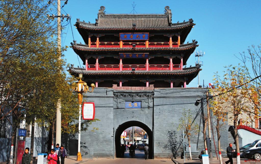 地處府城中心的鼓樓,是府城的最高建筑。明成化年間(1465年——1487年)建成,清光緒十七年(1891年)重修。鼓樓通高20米,磚石結(jié)構(gòu)臺基,上有三層建筑。鼓樓的奇特之處是底層磚碹洞是十字洞,東西南北四面皆通。東西兩個洞使七百戶街保持直通,成為寧武府城最長最寬的街。南北兩洞延伸,將頭百戶、三百戶、五百戶、九百戶幾條街連成一片,既便于排水,又方便出行。西門刻“鳳儀”,東門刻“含陽”,下題“光緒辛卯圜郡重建”。磚洞以上是三層木結(jié)構(gòu)建筑,面寬五間,進深四椽,四周圍廊,檐柱間設雀替。三重檐歇山頂,一重檐下東西設隔扇門,其余為墻體。二、三重檐下東西面懸匾,東為“樓煩重鎮(zhèn)”“毓秀鐘靈”,西為“奎光普照”“層霄聳翠”。鼓樓為省級文物保護單位。