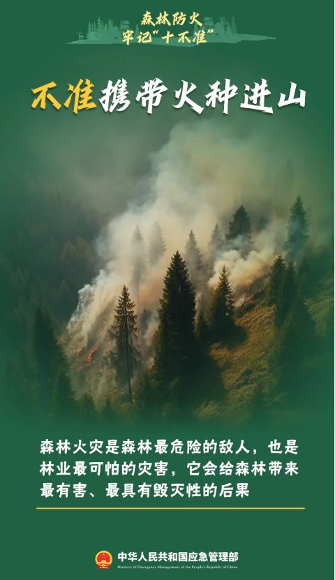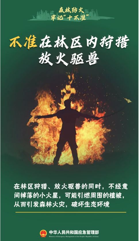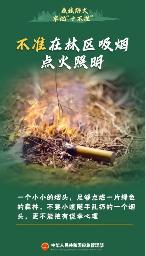 一次疏忽, 能使萬(wàn)畝綠色焚為灰燼一次大意, 能使森林瞬間化為烏有一個(gè)煙頭, 能打破生態(tài)的自然平衡......立冬后已進(jìn)入干季高度重視森林草原防滅火工作刻不容緩引起森林草原火災(zāi)的原因有哪些?遭遇森林草原火災(zāi)該怎么辦?森林草原防火知識(shí)快來(lái)一起學(xué)習(xí)吧↓↓↓科普 森林防火小知識(shí) 一、什么是森林防火?森林防火是指森林、林木和林地火災(zāi)的預(yù)防和撲救。 二、森林火災(zāi)的危害有哪些?森林火災(zāi)是指失去人為控制,在林地內(nèi)自由蔓延和擴(kuò)展,對(duì)森林、森林生態(tài)系統(tǒng)和人類帶來(lái)一定危害和損失的森林起火。森林火災(zāi)是一種突發(fā)性強(qiáng)、破壞性大、撲救極為困難的自然災(zāi)害,不但會(huì)燒毀成片的森林,傷害林內(nèi)的動(dòng)物,而且還會(huì)降低森林的更新能力,引起土壤的貧瘠,破壞森林涵養(yǎng)水源等,甚至導(dǎo)致生態(tài)環(huán)境失去平衡,引起空氣污染,威脅人民群眾生命財(cái)產(chǎn)安全。 三、引起森林火災(zāi)的原因有哪些?森林中喬木、灌木、草類、苔蘚、地衣、枯枝落葉等這些物質(zhì)都是可燃物。所謂“星星之火可以燎原”,即便有些植物水分含量較大,隨著時(shí)間的推移也會(huì)被火焰燃著,并蔓延成森林火災(zāi)。引發(fā)森林火災(zāi)的成因主要有兩個(gè): 四、森林火險(xiǎn)預(yù)警共劃分為幾個(gè)等級(jí)?根據(jù)森林火險(xiǎn)等級(jí)、火行為特征和可能造成的危害程度,將森林火險(xiǎn)預(yù)警級(jí)別劃分為四個(gè)等級(jí),由高到低依次用紅色、橙色、黃色和藍(lán)色表示。 五、撲救森林火災(zāi)的基本原則是什么?撲救森林火災(zāi)的基本原則是“打早、打小、打了”。打早是指及時(shí)撲火,打小是指撲打剛發(fā)生的火,打了是指撲火的徹底性,既要撲打明火,又要清理案火,消滅一切余火。三者相互聯(lián)系,相互影響。打早是滅火的前提,打小是滅火的關(guān)鍵,打了是滅火的核心。 六、遭遇森林火災(zāi)的逃生注意事項(xiàng)有哪些? 1、森林火災(zāi)對(duì)人身造成的傷害主要來(lái)自高溫、濃煙和一氧化碳,容易造成熱烤中暑、燒傷、窒息或中毒,尤其是一氧化碳具有潛伏性,會(huì)降低人的精神敏銳性,中毒后不容易被察覺(jué)。因此,一旦發(fā)現(xiàn)自己身處森林著火區(qū)域,應(yīng)當(dāng)使用沾濕的毛巾遮住口鼻,附近有水的話最好把身上的衣服浸濕,這樣就多了一層保護(hù)。 2、在森林中遭遇火災(zāi)一定要密切注意風(fēng)向的變化,因?yàn)轱L(fēng)向決定了大火的蔓延方向,也決定逃生的方向,應(yīng)當(dāng)逆風(fēng)逃生,不可順風(fēng)逃生。如果突然感覺(jué)到無(wú)風(fēng)的時(shí)候更不能麻痹大意,這時(shí)往往意味著風(fēng)向?qū)?huì)發(fā)生變化或者逆轉(zhuǎn),一旦逃避不及,容易造成傷亡。 3、當(dāng)煙塵襲來(lái)時(shí),用濕毛巾或衣服捂住口鼻迅速躲避。躲避不及時(shí),應(yīng)選在附近沒(méi)有可燃物的平地臥地避煙。切不可選擇低洼地或坑、洞,因?yàn)榈屯莸睾涂?、洞容易沉積煙塵。如果被大火包圍在半山腰時(shí),要快速向山下跑,切忌往山上跑,通?;饎?shì)向上蔓延的速度要比人跑快得多。 4、順利脫離火災(zāi)現(xiàn)場(chǎng)之后,在災(zāi)害現(xiàn)場(chǎng)附近休息時(shí)要防止蚊蟲(chóng)或者蛇、野獸、毒蜂的侵襲。集體或者結(jié)伴出游的朋友應(yīng)當(dāng)相互查看一下大家是否都在,如果有掉隊(duì)的應(yīng)當(dāng)及時(shí)向當(dāng)?shù)販缁鹁葹?zāi)人員求援。 七、森林防火“十不準(zhǔn)”是什么?