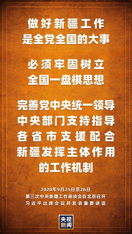 第三次中央新疆工作座談會(huì)9月25日至26日在北京召開(kāi)。中共中央總書(shū)記、國(guó)家主席、中央軍委主席習(xí)近平出席會(huì)議并發(fā)表重要講話。