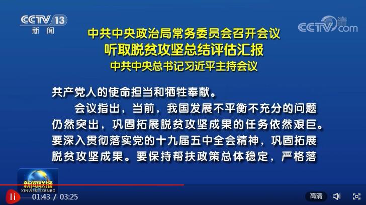 12月3日,中共中央政治局常務(wù)委員會(huì)召開會(huì)議,聽取脫貧攻堅(jiān)總結(jié)評(píng)估匯報(bào)。習(xí)近平總書記主持會(huì)議并發(fā)表重要講話。在講話中,總書記總結(jié)了黨的十八大以來(lái)脫貧攻堅(jiān)工作取得的成績(jī),肯定了各級(jí)黨委和政府以及社會(huì)協(xié)同發(fā)力、合力攻堅(jiān)的卓越付出。央視網(wǎng)《聯(lián)播+》特梳理講話及會(huì)議要點(diǎn),以饗讀者。