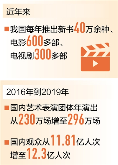 在作品質(zhì)量提升的同時(shí),我國(guó)文化產(chǎn)品的供給能力也在持續(xù)增強(qiáng)。目前我國(guó)每年推出新書40萬余種、童書4萬多種、電影600多部、電視劇300多部、動(dòng)漫400多部……眾多文化產(chǎn)品的生產(chǎn)規(guī)模位居世界前列。演出市場(chǎng)持續(xù)繁榮,2016年到2019年,國(guó)內(nèi)藝術(shù)表演團(tuán)體年演出場(chǎng)次從230萬場(chǎng)增長(zhǎng)至296萬場(chǎng),國(guó)內(nèi)觀眾從11.81億人次增加至12.3億人次,其中農(nóng)村觀眾超過7億人次。