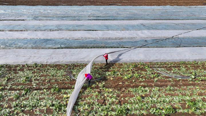 △2025年12月11日,山東東營廣饒縣,農民為作物覆蓋防寒無紡布。