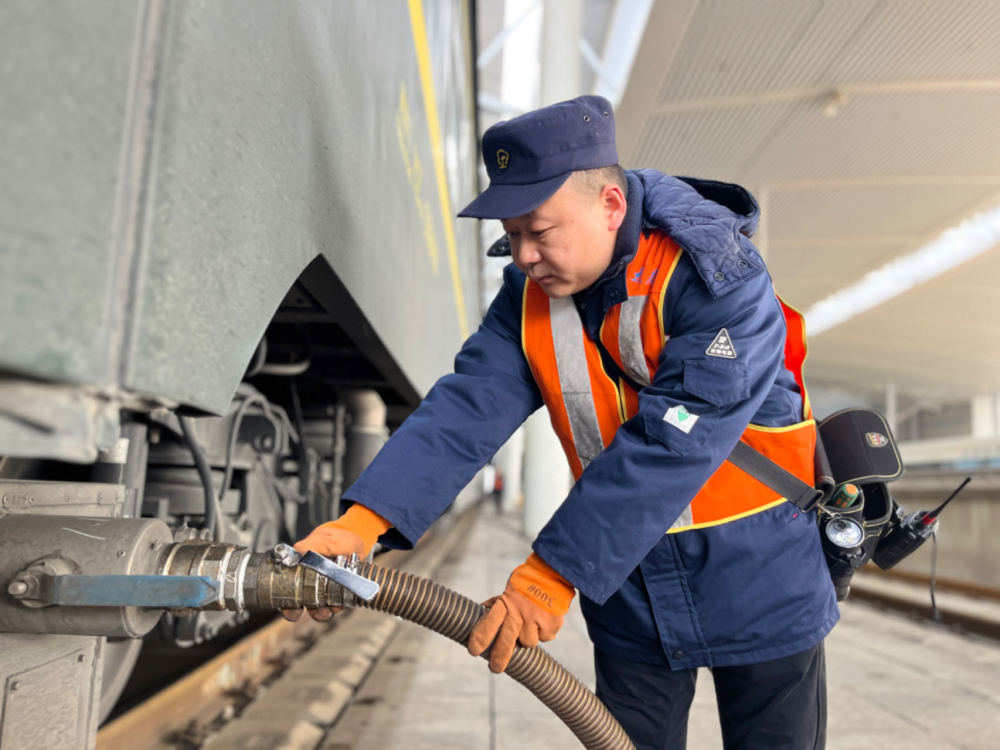 作為山西境內(nèi)唯一的通過(guò)車吸污作業(yè)點(diǎn),太原南站吸污作業(yè)點(diǎn)全年無(wú)休,承擔(dān)著通過(guò)太原南站的普速、動(dòng)車、高鐵的吸污作業(yè)。春運(yùn)期間,吸污工作量加大,除去臨時(shí)加增的吸污作業(yè)任務(wù),每天從早上7點(diǎn)至夜間12點(diǎn),固定有14輛列車需要進(jìn)行吸污作業(yè)。