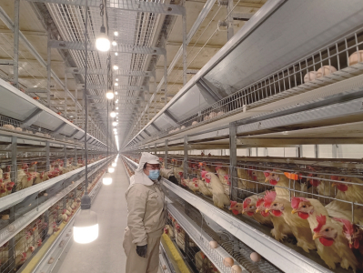 穿上無菌服,陳璐帶記者參觀雞舍。墻面是彩鋼夾芯板,耐腐、防火,保溫性能卓越,有效保障雞舍一年四季溫度恒定。雞籠表面是進口鋁鋅合金涂層,顯著降低破蛋率、污蛋率。雞舍內安裝有智能環(huán)境控制系統(tǒng),實時顯示和控制雞舍內溫度、濕度、二氧化碳濃度、光照、通風等環(huán)境指標?!耙坏┠骋豁椫笜说陀诨蛘叱^設定范圍,系統(tǒng)就會啟動各項設備,直至指標恢復正常。”陳璐說。