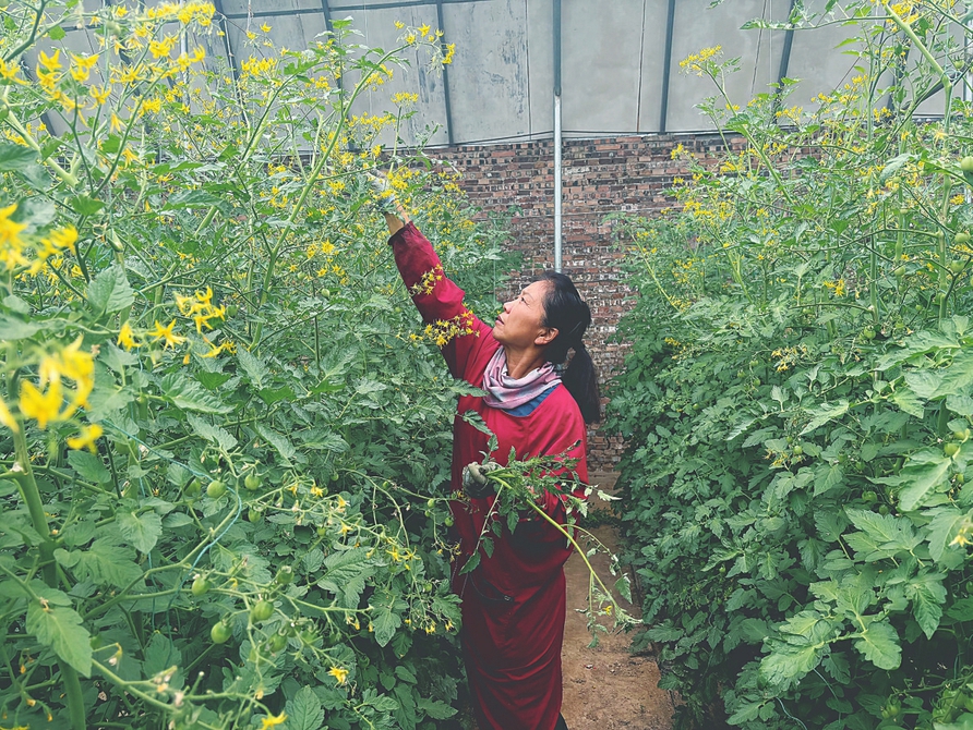 山河村大棚采摘園的工作人員正在給小番茄打杈。本報實習記者姚雅馨攝