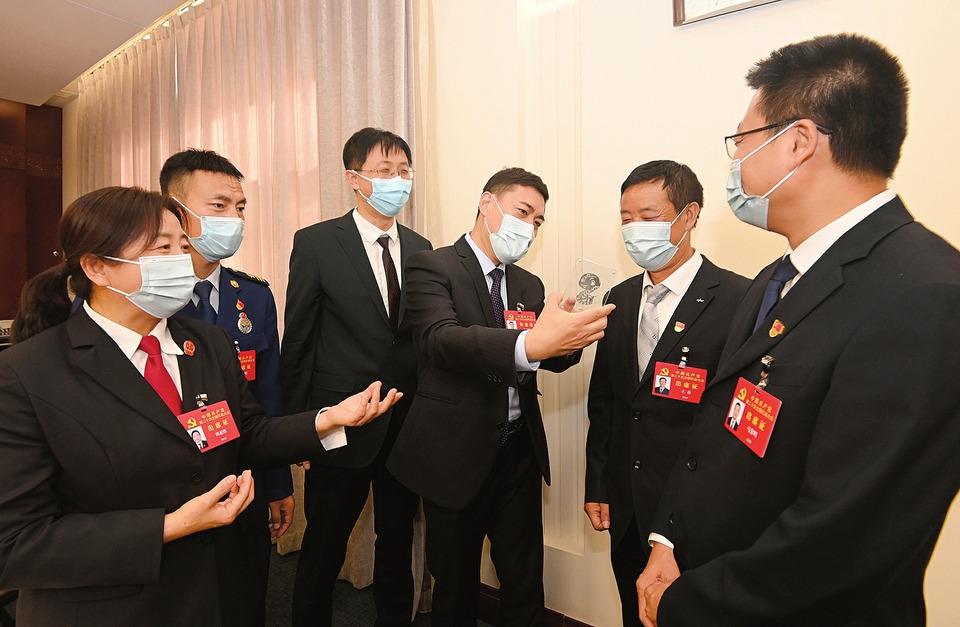 10月18日,出席黨的二十大的山西團(tuán)代表田亞欣、張高峰、張靖、牛國棟、王春、馬黎明(自左至右)在會議間隙圍繞創(chuàng)新是第一動力話題展開討論。(記者李聯(lián)軍攝)