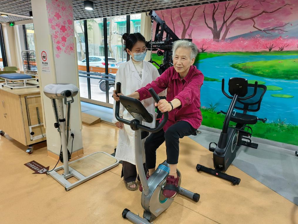杭州市拱墅區(qū)大關(guān)街道德勝社區(qū)樂齡家養(yǎng)老園,醫(yī)護人員幫助老人進行康復性訓練。新華社記者 李平 攝