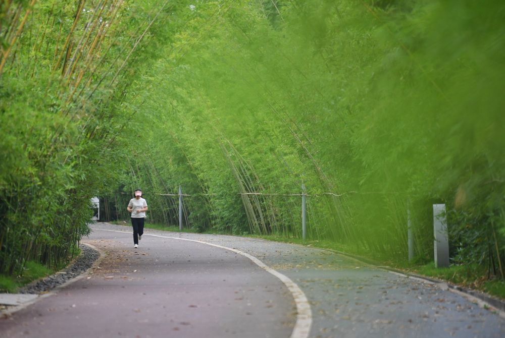 在四川省宜賓市江安縣長江竹島,市民在由河中村改造成的綠色生態(tài)公園里跑步(2023年5月31日攝)。新華社記者 劉坤 攝