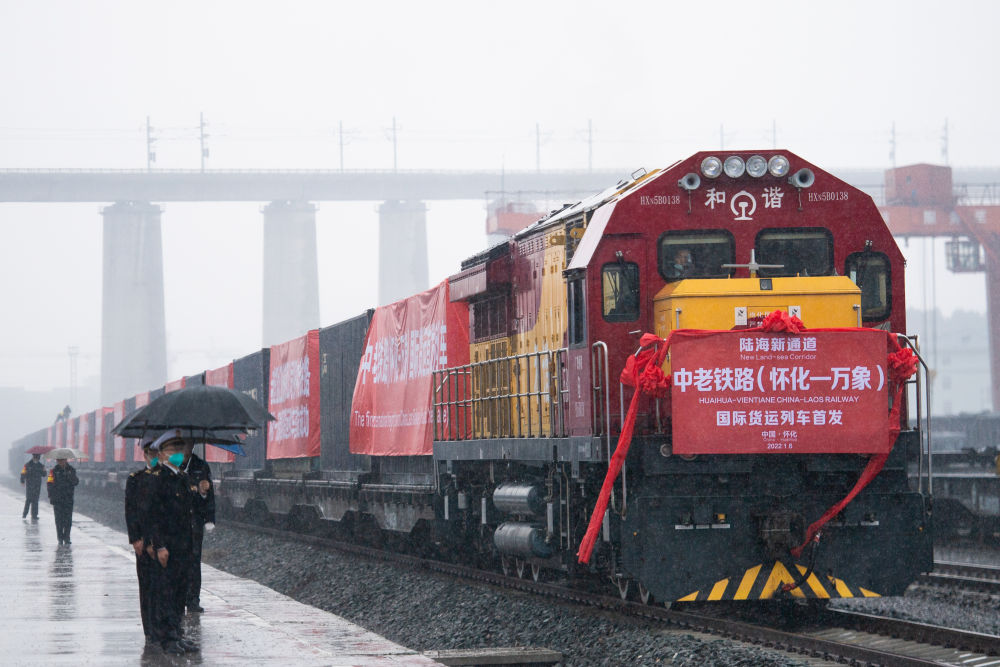 開往老撾萬象的中老鐵路(懷化—萬象)國際貨運列車在湖南懷化國際陸港準(zhǔn)備發(fā)車(2023年1月6日攝)。新華社記者 陳思汗 攝