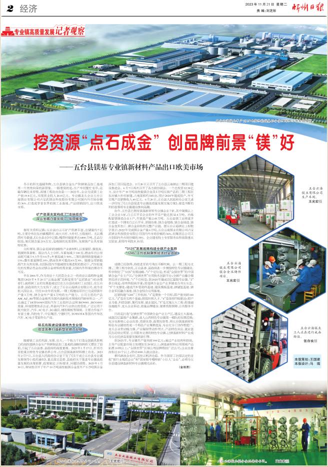 如今,五臺縣委、縣政府以一期項(xiàng)目工程為支撐,二期項(xiàng)目工程為依托,進(jìn)一歩圍繞特色專業(yè)鎮(zhèn)建設(shè),科學(xué)制定了“3125”發(fā)展戰(zhàn)略?!?”個定位是:形成全鎂世界的中國鎂合金產(chǎn)業(yè)主產(chǎn)區(qū)、全鎂世界應(yīng)用技術(shù)創(chuàng)新平臺、全鎂產(chǎn)業(yè)融合循環(huán)經(jīng)濟(jì)示范樣板;“1”個目標(biāo)是:到2025年建成百億量級專業(yè)鎮(zhèn);“2”條主線是:培育和招商并重、營造鎂合金全產(chǎn)業(yè)多鏈競合共生生態(tài);“5”個支撐是:建成汽車零部件基地、建筑模板基地、鎂儲氫基地、鎂合金軍民融合基地、鎂合金綜合應(yīng)用基地。該縣還構(gòu)建了“1245”工作機(jī)制。“1”是聚焦一個目標(biāo):產(chǎn)值突破100億元;“2”是夯實(shí)兩個基礎(chǔ):組織和人才;“4”是堅持四輪驅(qū)動:產(chǎn)業(yè)為基、科技創(chuàng)新、集約發(fā)展、就業(yè)富民;“5”是實(shí)施五大工程:基礎(chǔ)設(shè)施提升、龍頭企業(yè)帶動、質(zhì)量品牌建設(shè)、要素資源保障、公共服務(wù)平臺。五臺縣將鎂產(chǎn)業(yè)融入宇宙產(chǎn)業(yè)發(fā)展空間,申報“全鎂世界”區(qū)域公用商標(biāo),讓五臺鎂產(chǎn)業(yè)進(jìn)一步走向世界。 (金俊賢)