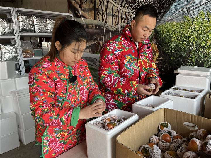 現(xiàn)在正值盤錦堿地柿子集中上市時期,王海濤和張爽每天都忙得團團轉(zhuǎn)?!敖衲暧唵瘟勘热ツ昝黠@增加不少,上升到每天200單左右。”張爽說。