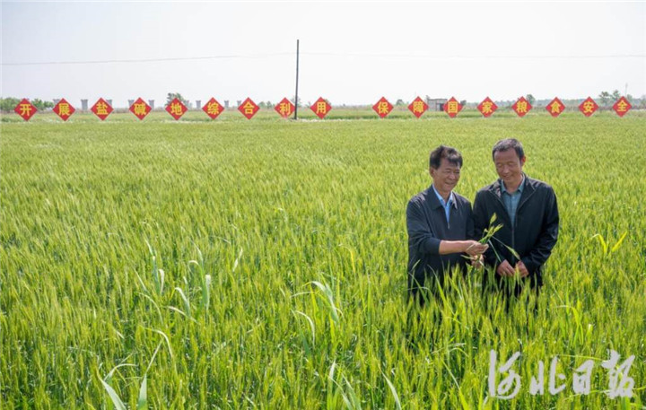 2023年5月,河北省滄州市黃驊市舊城鎮(zhèn)仙莊片區(qū)旱堿地麥田,后仙莊村村民楊東進(jìn)(右)和后仙莊村黨支部副書記劉玉鎖一起查看旱堿麥生長狀況。 河北日報記者 趙杰 攝