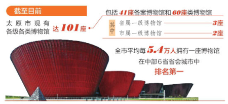太原市充分發(fā)揮文物資源優(yōu)勢,將博物館作為文物保護(hù)利用改革的突破口,傾力建設(shè)凸顯地方文化特色的“博物館之城”。截至目前,太原市現(xiàn)有各級各類博物館達(dá)101座,包括41座備案博物館和60座類博物館,其中省屬一級博物館3座、市屬一級博物館2座。全市平均每5.4萬人擁有一座博物館,在中部6省省會(huì)城市中排名第一,遠(yuǎn)超全國平均水平。