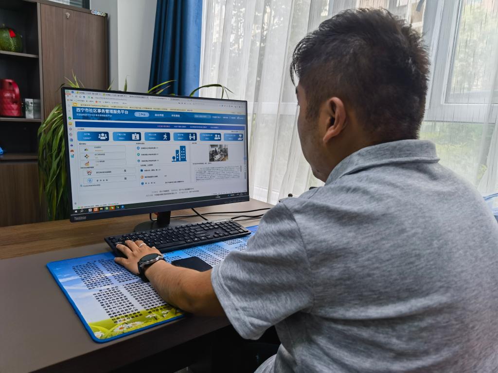 7月7日,青海省西寧市城中區(qū)南川西路街道安寧路社區(qū)工作人員正在操作社區(qū)事務管理服務平臺。新華社記者 柳澤興 攝
