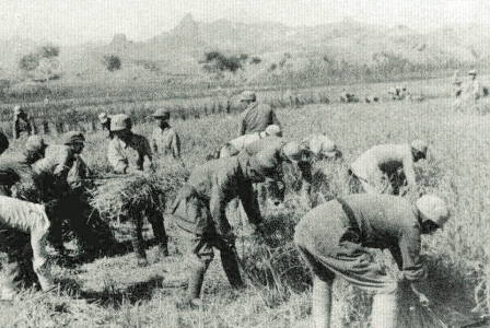 八路軍某部和群眾一起采集樹葉充饑,堅(jiān)持抗戰(zhàn)。