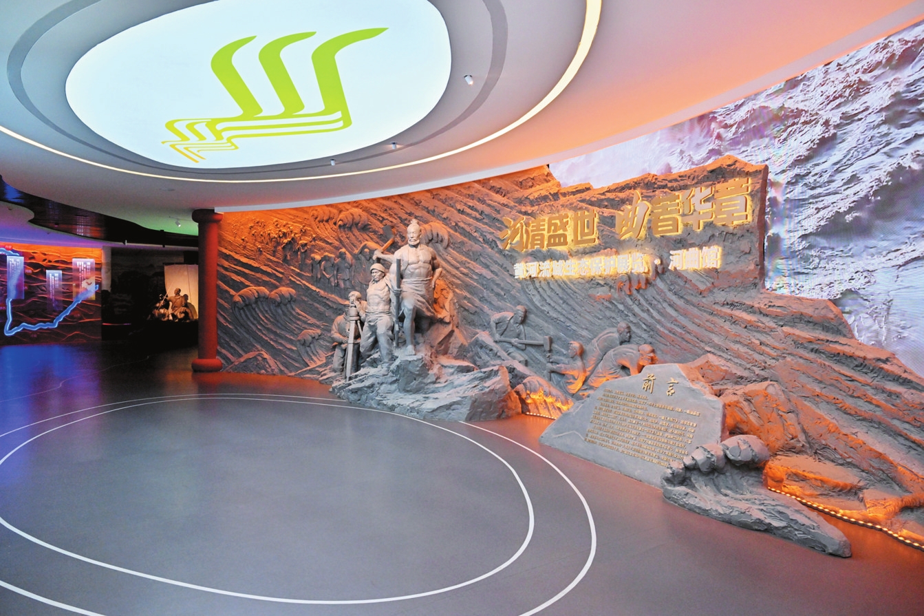在第五篇章“大河之夢·生態(tài)和諧”展區(qū)的弧幕影院里,《河清盛世曲著華章》主題影片展現(xiàn)著新時代圖景:國家園林縣城的林蔭道上,光伏板與古長城交相輝映;黃河濕地公園里,黑鸛與白天鵝掠過水面;整溝治理后的山坡上,民宿集群飄起裊裊炊煙。