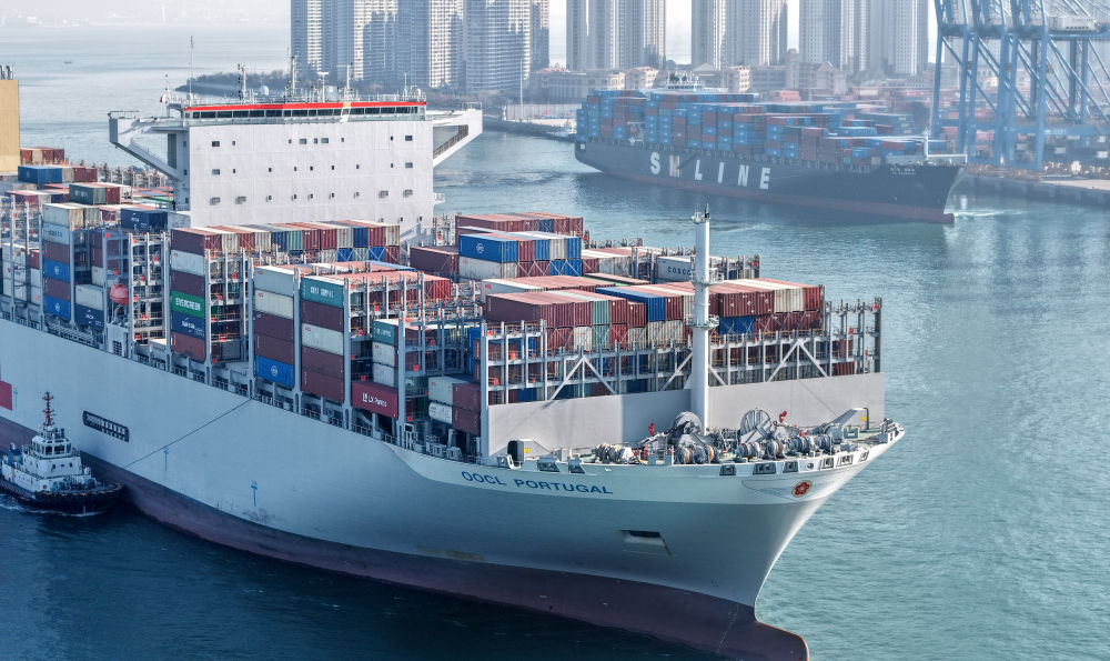 2025年12月4日,貨輪進(jìn)出山東港口青島港前灣港區(qū)(無(wú)人機(jī)照片)。新華社記者 李紫恒 攝